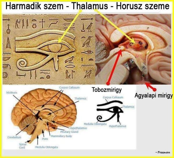 A tobozmirigy (epitalamusz), ami a Harmadik Szemünk. Egyiptomban ugyanez Hórusz Szeme. A lelkünk székhelye, egy kis fenyőtoboz alakú szerv az agyunk belsejében, mely hormonokat választ ki, mint a melatonin, a szerotonin és a DMT (Dimethyltryptamine), ami ‘Lélek Molekulaként’ ismert. A tobozmirigy pontosan a két agyfélteke között helyezkedik el, felelős a melatonin és a szerotonin hormonok termeléséért is. Ez a két hormon felelős a normális alvási tevékenységek, az álmok, a meditatív állapotok, az öröm, a hála és a szeretet minőségek fenntartásáért, áramoltatásáért. Ugyanezen hormonok hatására vagyunk képesek az időutazásra, paranormális képességekre, és a valódi spirituális út, az életutunk, az életfeladatunk megélésére, a krisztusi energiák és a krisztusi tudatminőségek tartására is.